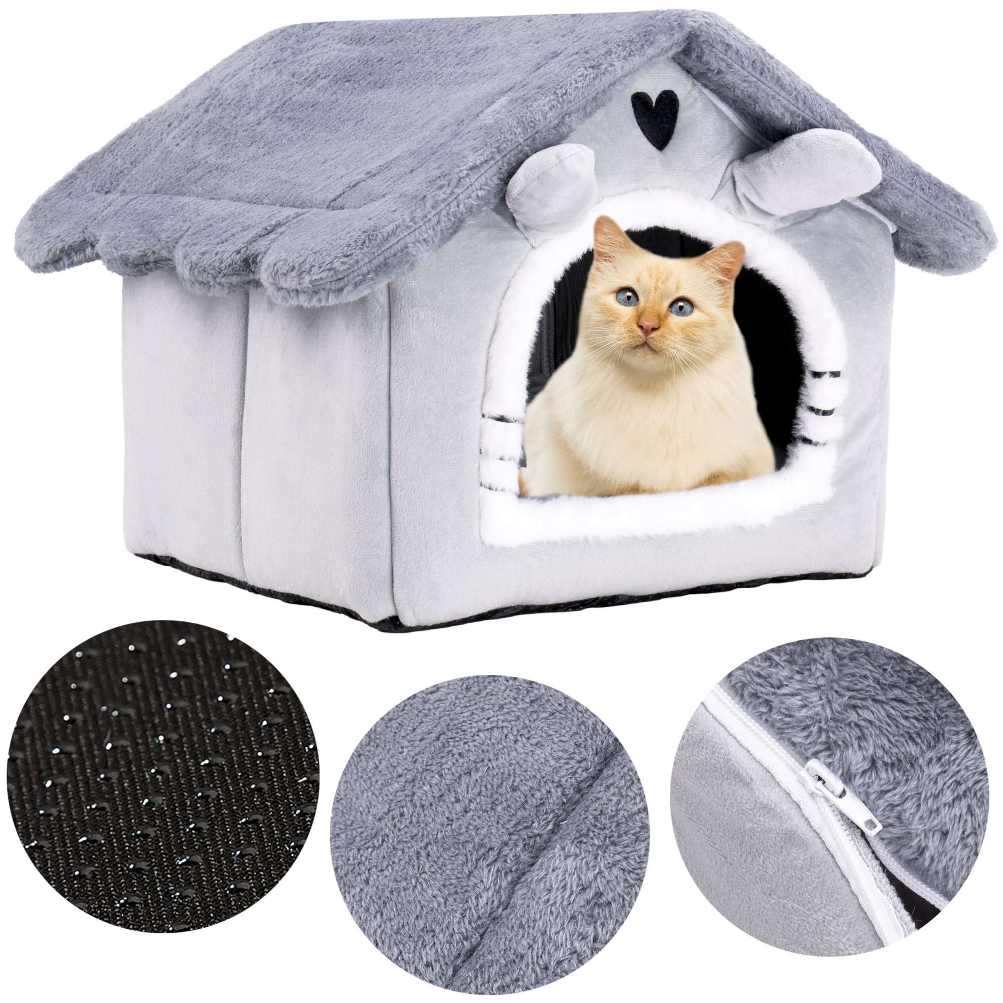 Cu un design practic, casa dispune de o perna interioara detasabila, usor de curatat, si de o baza antiderapanta care previne alunecarea pe podele netede. Acoperisul retractabil, dotat cu fermoar, permite o curatare rapida si o utilizare versatila, adaptandu-se preferintelor pisicii tale.