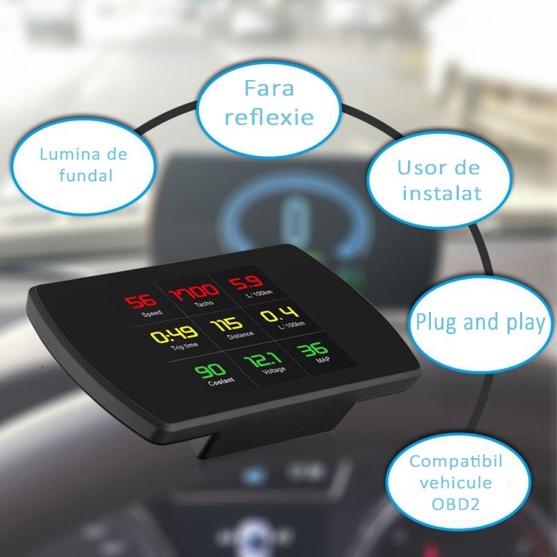 Dispozitivul afiseaza datele de drum, si anume: viteza vehiculului, turatia motorului, temperatura apei, consumul de carburant, timpul de condus si distanta, alarma viteza si alarma cod in cazul unei avarii la motorul autoturismului.