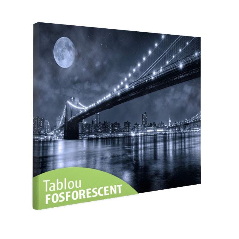 Tabloul fosforescent Brooklyn este o imprimare de inalta rezolutie pe canvas profesional, avand proprietatea de a lumina in intuneric. In prezenta luminii naturale sau artificiale arata ca orice alt tablou obisnuit dar in intuneric imaginile imprimate devin vizibile dezvaluind imagini suprinzatoare. Cerneala folosita la imprimare este ecologica si nu contine plumb sau fosfor avand o mare putere de retinere-emitere de energie prin absorbtia luminii naturale sau artificiale.