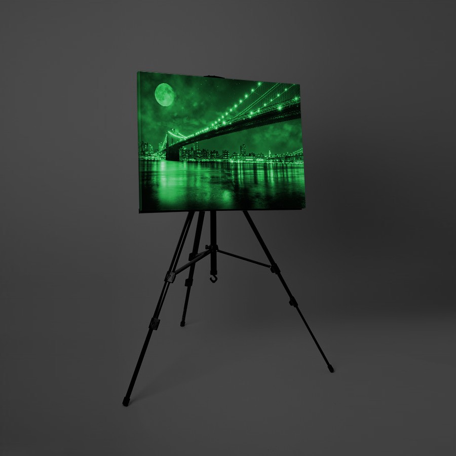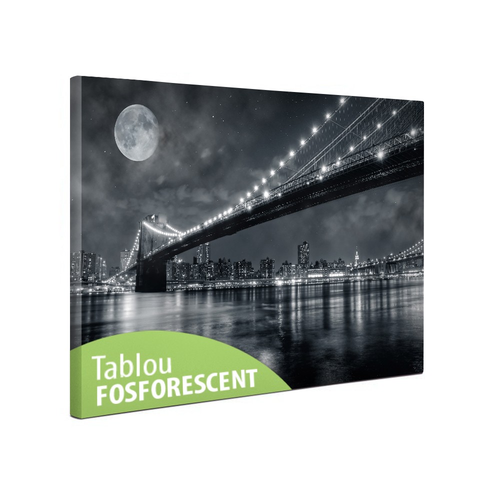 Tabloul fosforescent Brooklin Bridge este o imprimare de inalta rezolutie pe canvas profesional, avand proprietatea de a lumina in intuneric. In prezenta luminii naturale sau artificiale arata ca orice alt tablou obisnuit dar in intuneric imaginile imprimate devin vizibile dezvaluind imagini suprinzatoare. Cerneala folosita la imprimare este ecologica si nu contine plumb sau fosfor avand o mare putere de retinere-emitere de energie prin absorbtia luminii naturale sau artificiale.