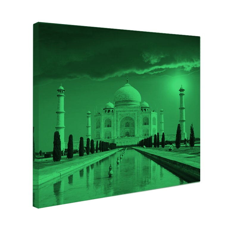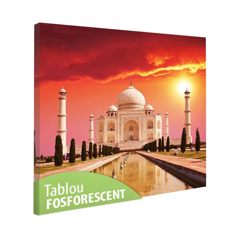 Tabloul fosforescent Taj Mahal este o imprimare de inalta rezolutie pe canvas profesional, avand proprietatea de a lumina in intuneric. In prezenta luminii naturale sau artificiale arata ca orice alt tablou obisnuit dar in intuneric imaginile imprimate devin vizibile dezvaluind imagini suprinzatoare. Cerneala folosita la imprimare este ecologica si nu contine plumb sau fosfor avand o mare putere de retinere-emitere de energie prin absorbtia luminii naturale sau artificiale.