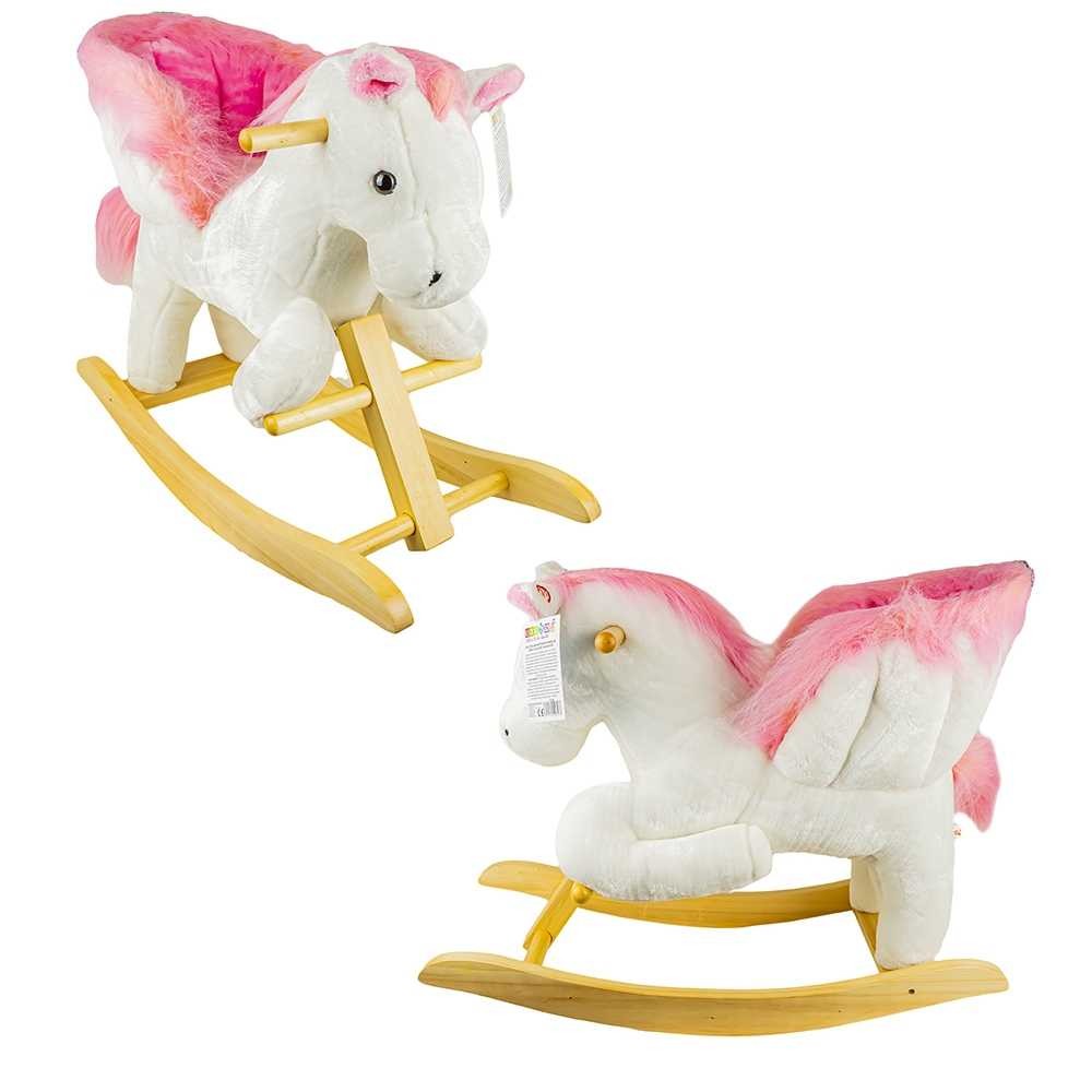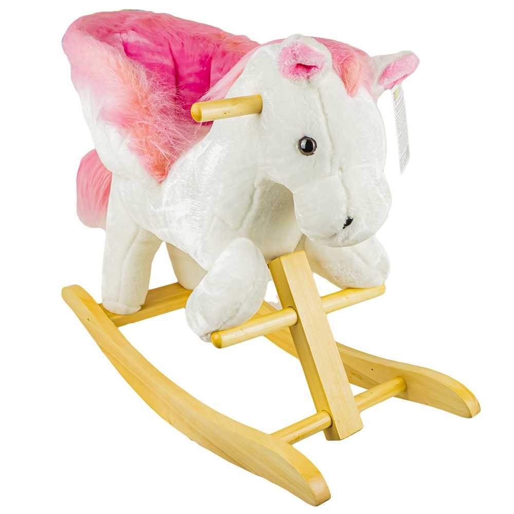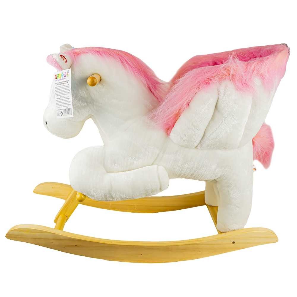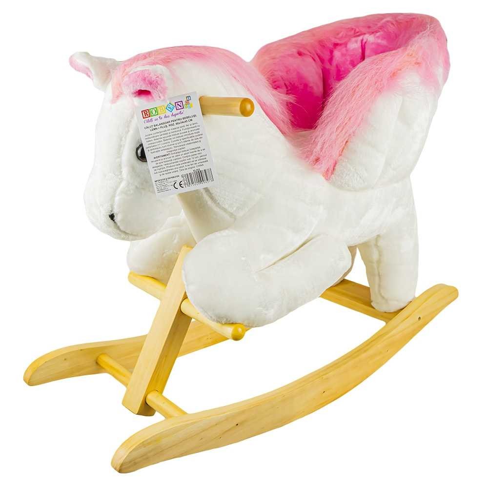 Balansoar tip calut, cu dimensiunile de 60x34x45 cm este recomandat copiilor cu varsta de peste 3 ani. Este confectionat din lemn finisat si plus moale, de culoare roz si alb, de care fetitele o sa fie cu siguranta incantate. Este prevazut cu centura de siguranta si cu 2 manere de care copiii se pot tine pentru o mai buna stabilitate. Copiii se pot bucura si de sunete muzicale, cu ajutorul unui comutator on/off.