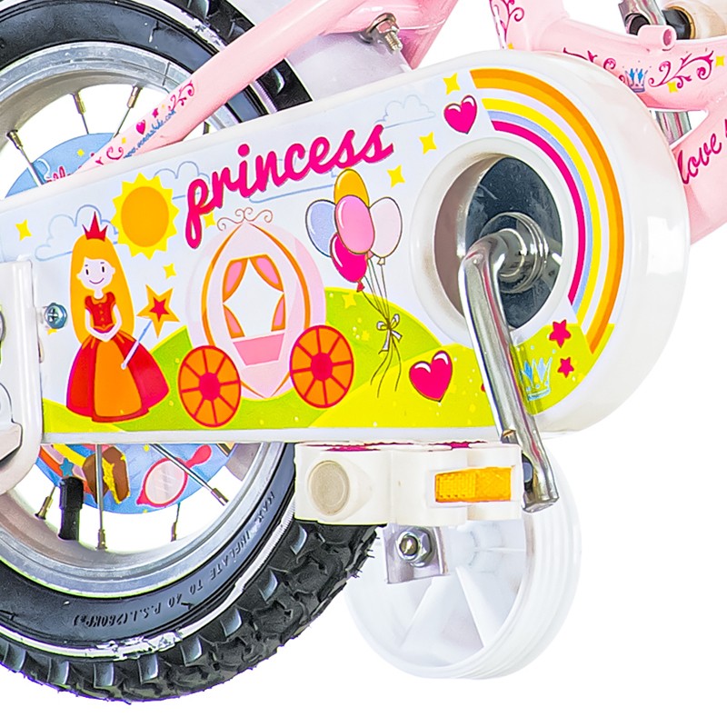 Bicicleta este echipata cu 2 roti ajutatoare care fac ca procesul de invatare sa fie mai usor, oferindu-i fetitei stabilitatea de care are nevoie. Odata cu trecerea timpului, cand nu va mai fi nevoie, rotile se pot detasa cu usurinta. Atat saua cat si ghidonul se regleaza in inaltime pentru a asigura un confort sporit.