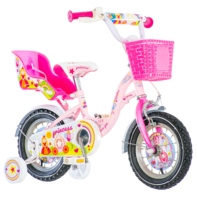 Bicicleta 12 inch, cos si scaun papusi, roti ajutatoare, V-Brake, Princess roz