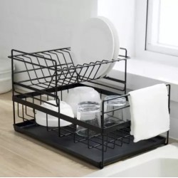Suport scurgere vase, 2 niveluri, 9 compartimente farfurii, 2 compartimente tacamuri, rezistenta coroziune, universal, fier/PP, 43x29x27 cm, negru