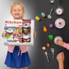 Util in mica bucatarie a copilului dvs., acest set complex este perfect pentru pregatit, preparat si servit mancarea. Setul include: 2 oale metalice, 2 capace, 1 tigaie metalica, sita, 4 ustensile de bucatarie, 2 recipiente pentru sare si piper si produse alimentare precum carne, pui, peste, carnat, ou ochi, ciuperca, ardei gras, morcov, usturoi, varza.