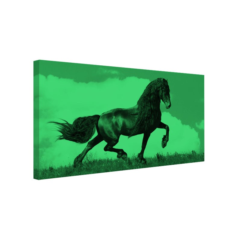 Tabloul fosforescent Cal negru pe pajiste este o imprimare de inalta rezolutie pe canvas profesional, avand proprietatea de a lumina in intuneric. In prezenta luminii naturale sau artificiale arata ca orice alt tablou obisnuit dar in intuneric imaginile imprimate devin vizibile dezvaluind imagini suprinzatoare. Cerneala folosita la imprimare este ecologica si nu contine plumb sau fosfor avand o mare putere de retinere-emitere de energie prin absorbtia luminii naturale sau artificiale.