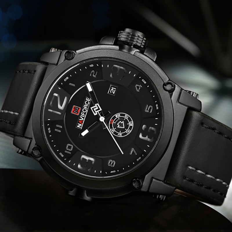 Ceas de mana barbatesc Naviforce, analog Quartz, 3ATM, data, saptamana, curea piele, negru