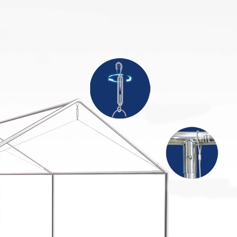 Cadrul pavilionului auto este fabricat dintr-un otel de calitate inalta, galvanizat, acesta fiind foarte rezistent in timp. Acoperisul este intarit suplimentar cu 3 cabluri de otel pentru a intari intreaga structura si o face mult mai sigura si ferma, previne rasucirea structurii si poate rezista la presiuni mult mai mari.