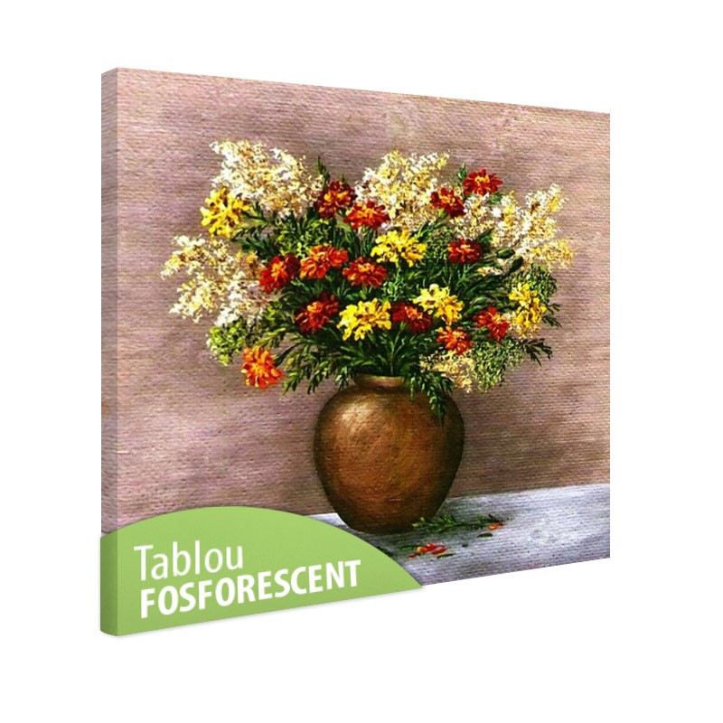 Tabloul fosforescent Galbenele este o imprimare de inalta rezolutie pe canvas profesional, avand proprietatea de a lumina in intuneric. In prezenta luminii naturale sau artificiale arata ca orice alt tablou obisnuit dar in intuneric imaginile imprimate devin vizibile dezvaluind imagini suprinzatoare. Cerneala folosita la imprimare este ecologica si nu contine plumb sau fosfor avand o mare putere de retinere-emitere de energie prin absorbtia luminii naturale sau artificiale.