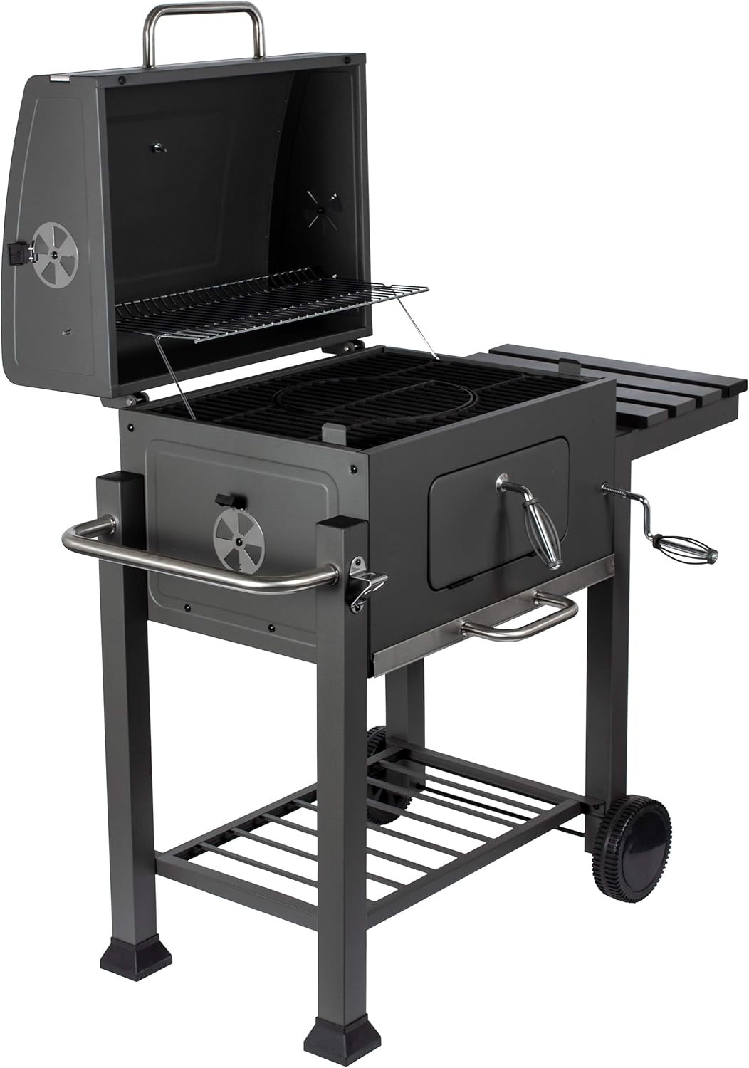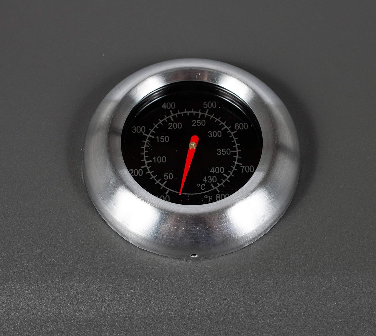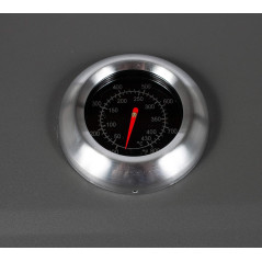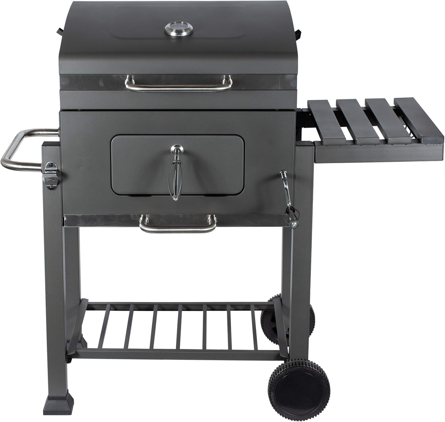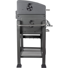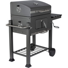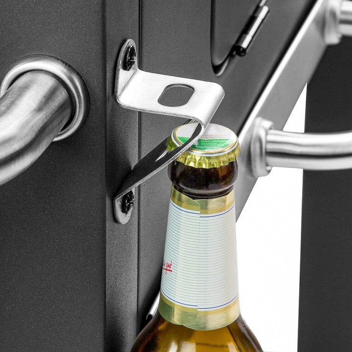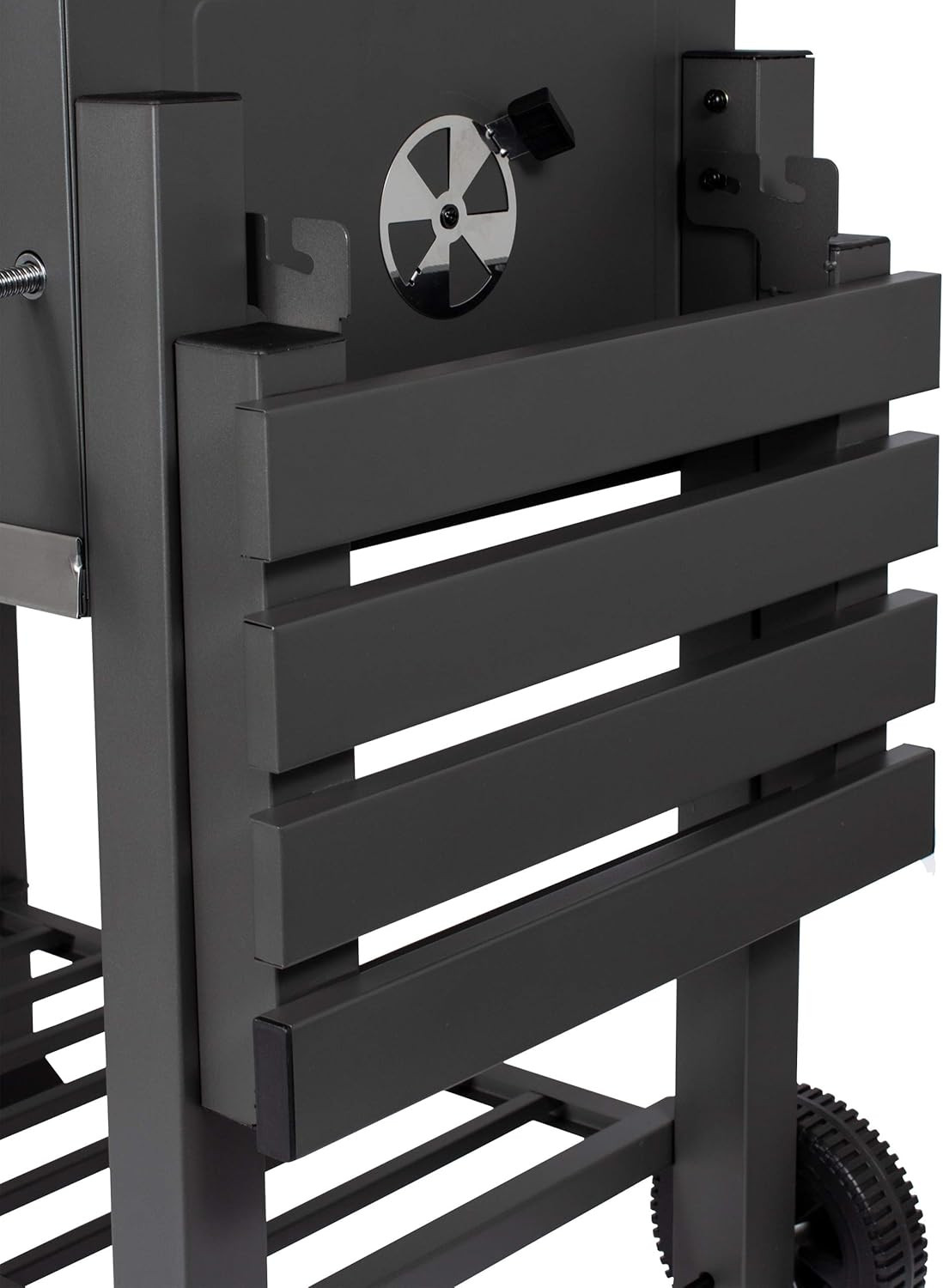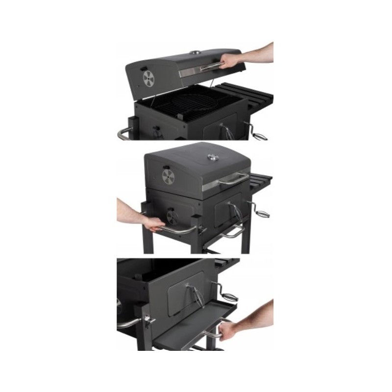 Capacul rabatabil prevazut cu termometru integrat (0–430°C) permite monitorizarea precisa a temperaturii, fiind ideal pentru coacerea lenta sau gatitul uniform, mentinand gustul autentic. Rotile rezistente, raftul lateral si inferior si deschizatorul de sticle integrat transforma gatitul intr-o activitate placuta si organizata.