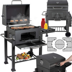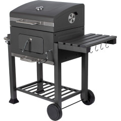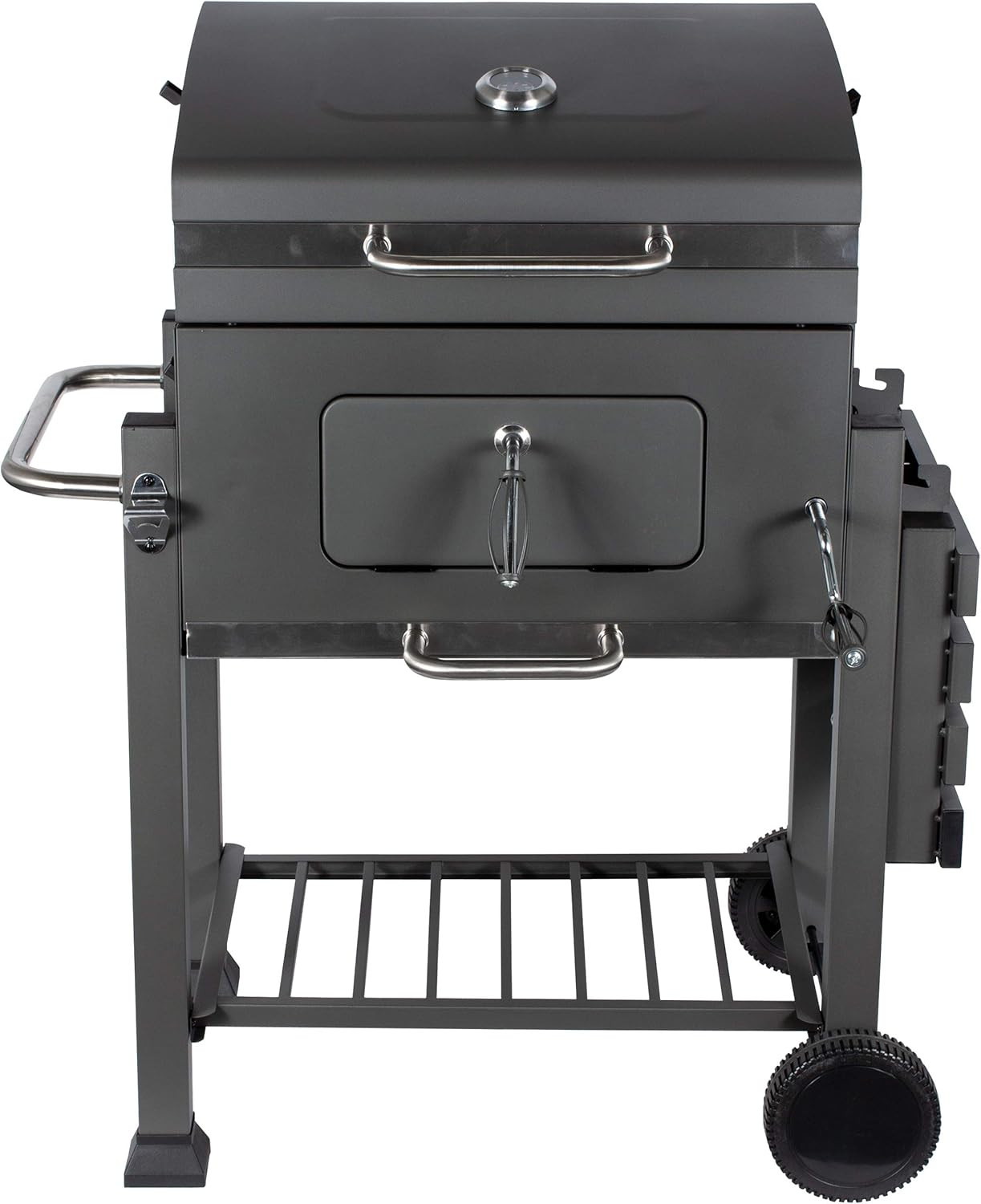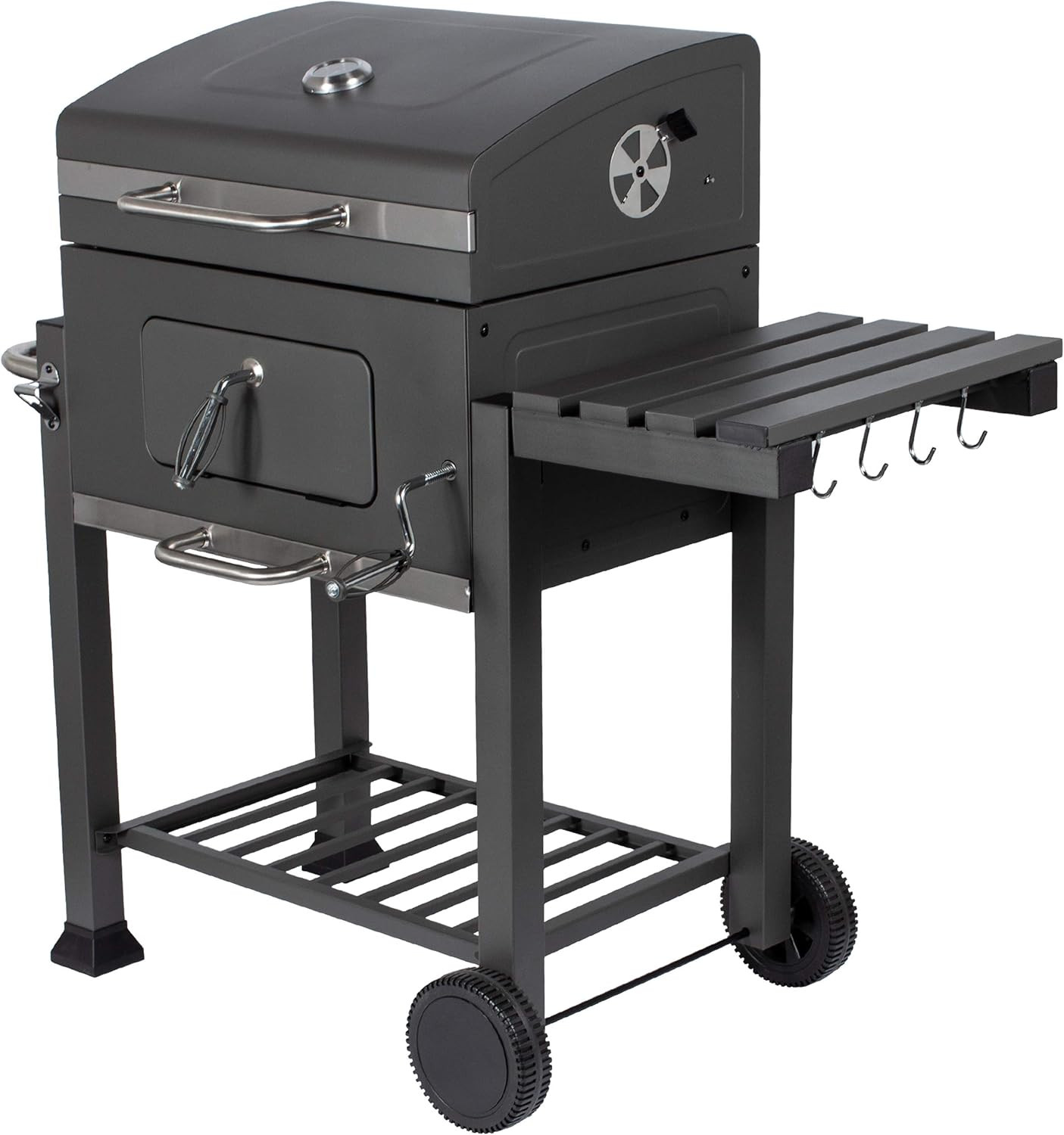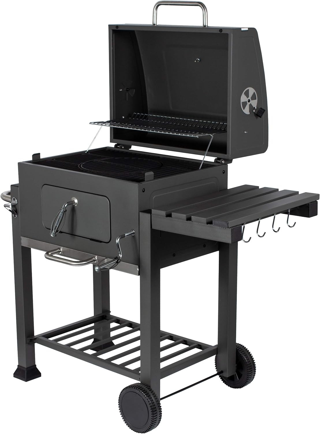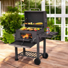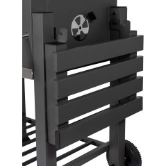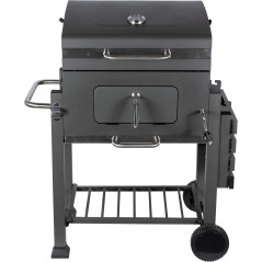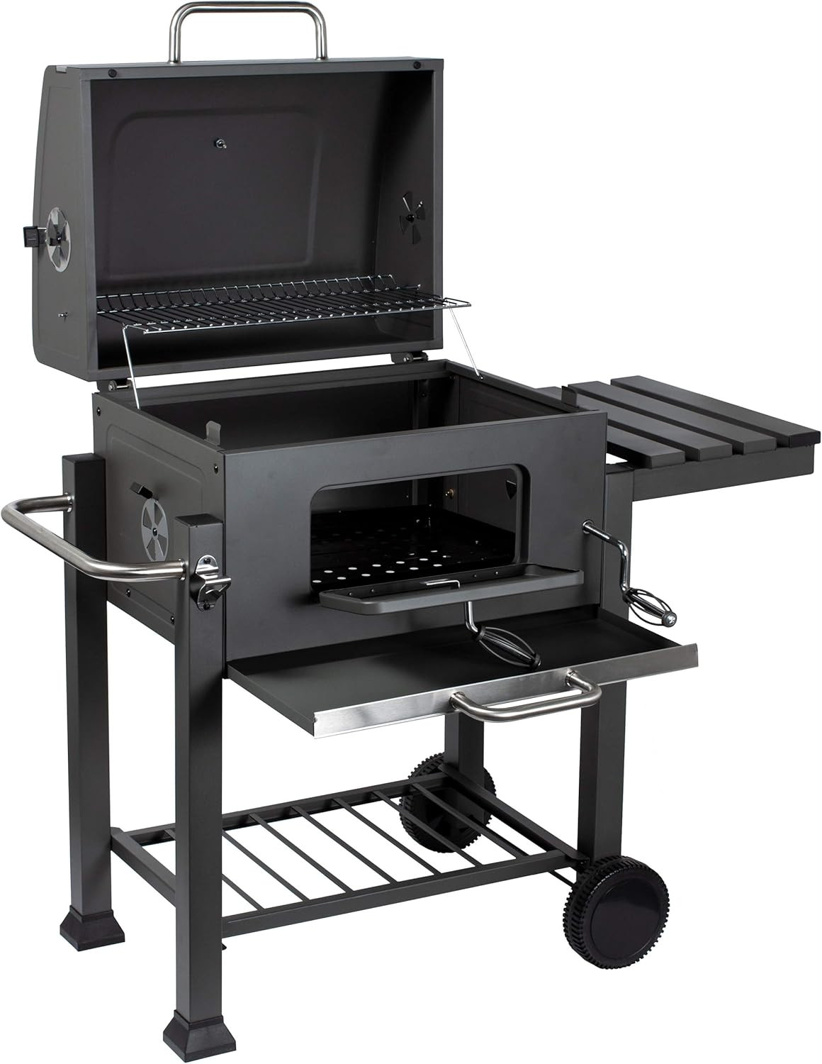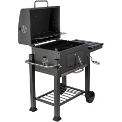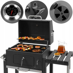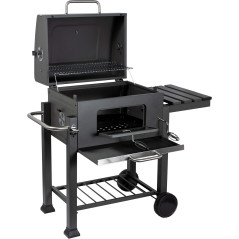 Capacul rabatabil prevazut cu termometru integrat (0–430°C) permite monitorizarea precisa a temperaturii, fiind ideal pentru coacerea lenta sau gatitul uniform, mentinand gustul autentic. Rotile rezistente, raftul lateral si inferior si deschizatorul de sticle integrat transforma gatitul intr-o activitate placuta si organizata.