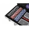 Setul cuprinde o cutie de aluminiu, 300 jetoane in 5 culori, doua pachete de carti a cate 54 bucati fiecare si 5 zaruri, confectionate din plastic durabil, dar si un buton dealer. Carcasa din aluminiu are un maner ergonomic si va ofera o optiune convenabila pentru depozitare dar si pentru transportare. Interiorul valizei este securizat astfel incat fiecare piesa are locul ei iar pe cealalta parte se afla un burete care stabilizeaza interiorul in timpul transportului.