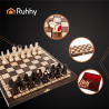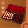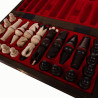 Setul este livrat intr-o valiza din lemn cu inchidere metalica, special conceputa pentru protectia si depozitarea pieselor. Interiorul este prevazut cu insertii de burete sau catifea, fiecare piesa avand un loc bine definit, evitandu-se astfel zgarieturile sau deteriorarea in timpul transportului. Tabla de joc este integrata elegant in partea exterioara a valizei, transformand acest set intr-un obiect decorativ perfect pentru biblioteci, birouri sau sali de sedinta.