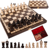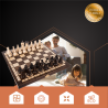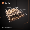 Jocul de sah regal din lemn este o piesa de colectie ce imbina rafinamentul traditiei cu eleganta executiei artizanale. Tabla de joc, cu dimensiunile de 30,5 x 30,5 x 2 cm, este realizata din lemn natural, finisat cu grija, cu patratele contrastante in tonuri calde, oferind o suprafata placuta la atingere si o estetica clasica.
