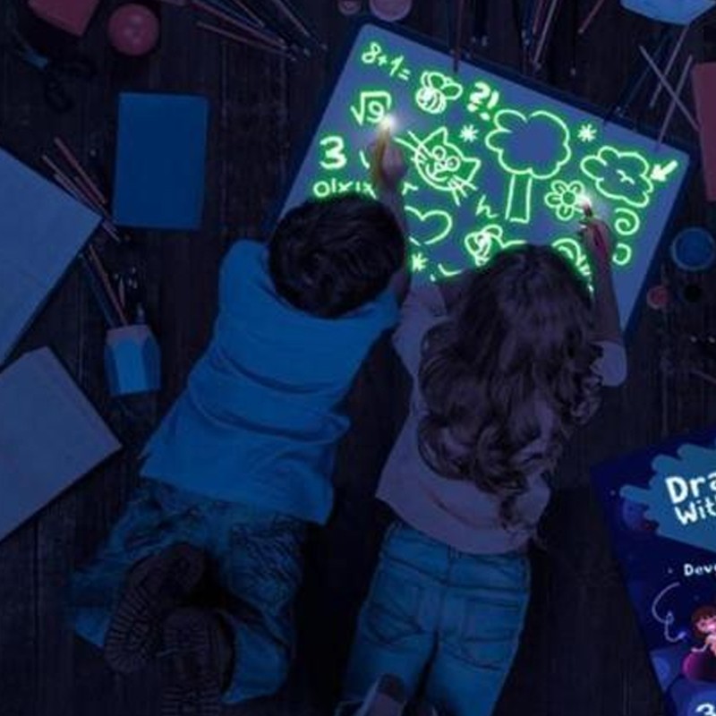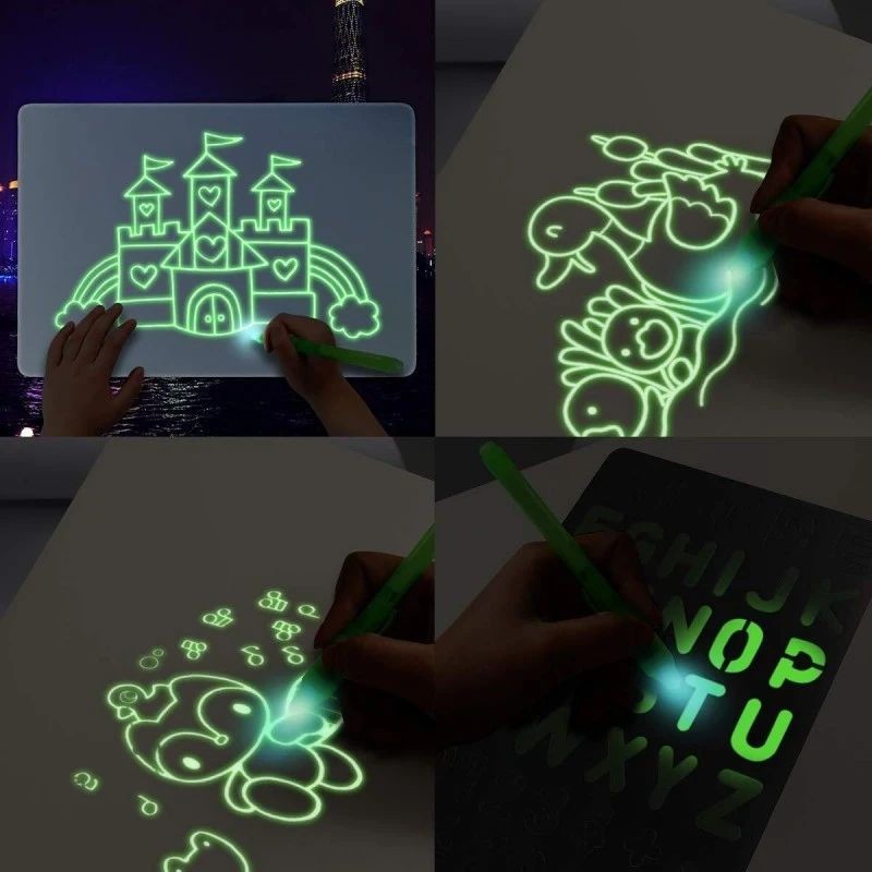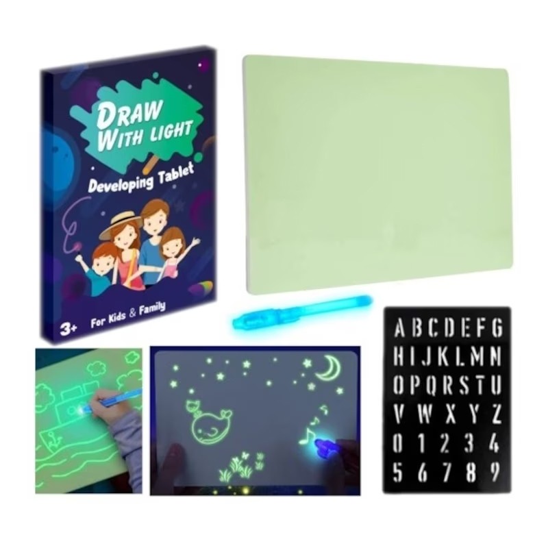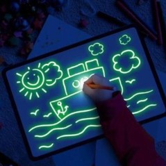 Cu o suprafata de lucru mai mare, tablita in format A3 ofera mai mult spatiu pentru exprimarea creativitatii, fiind ideala pentru copii care adora sa deseneze si sa exploreze. Tablita permite desenarea cu lumina UV, creand imagini care stralucesc in intuneric si se estompeaza dupa un timp, oferind o joaca interactiva si fara risipa de hartie. Desenele realizate pe aceasta tablita dispar treptat, permitandu-le copiilor sa creeze si sa recreeze de nenumarate ori fara a fi nevoie de stergere manuala.
