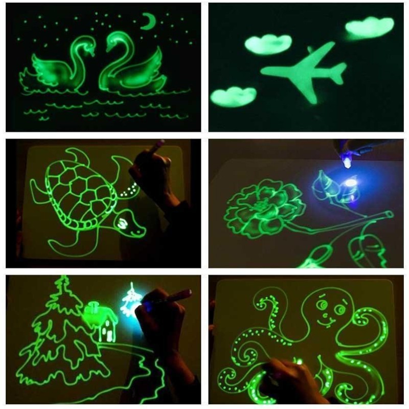 Breloc UV inclus este folosit pentru a crea desene luminoase pe suprafata fosforescenta, fara cerneala sau vopsea, transformand procesul de desen intr-o experienta fascinanta. Desenul cu lumina UV stimuleaza curiozitatea si dezvolta imaginatia, fiind o activitate interactiva si captivanta pentru copii.