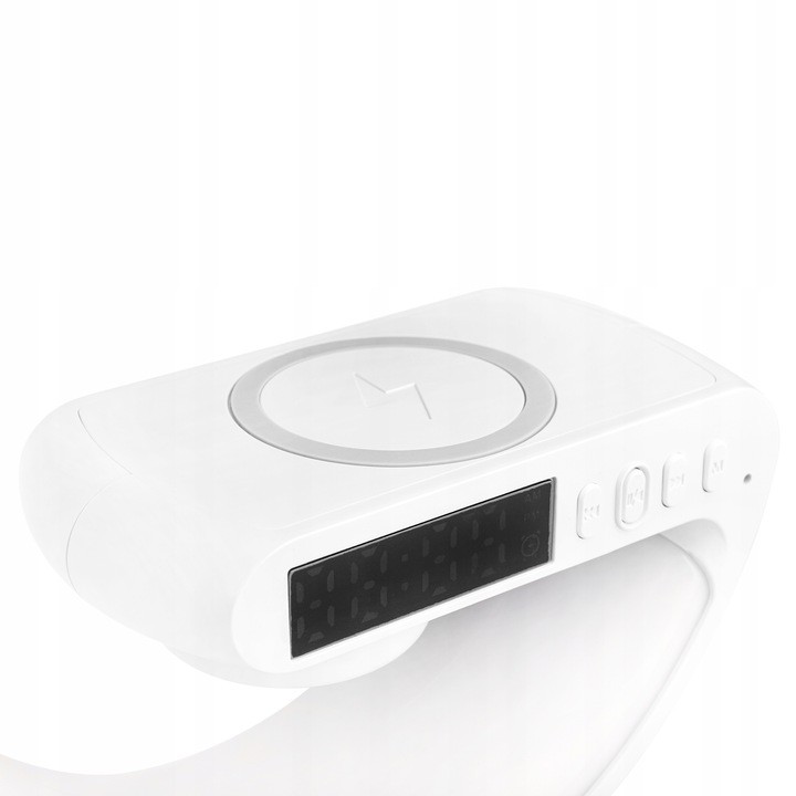 Lampa de birou LED G-Shape RGB 5W, difuzor Bluetooth 155 mm, incarcare wireless Qi, ceas cu alarma, radio FM, 420 lm