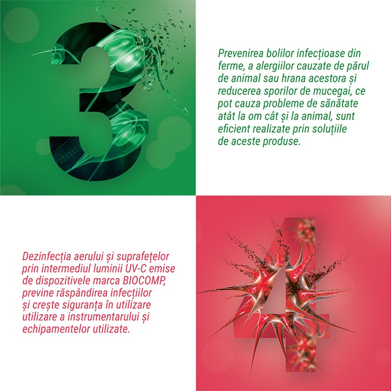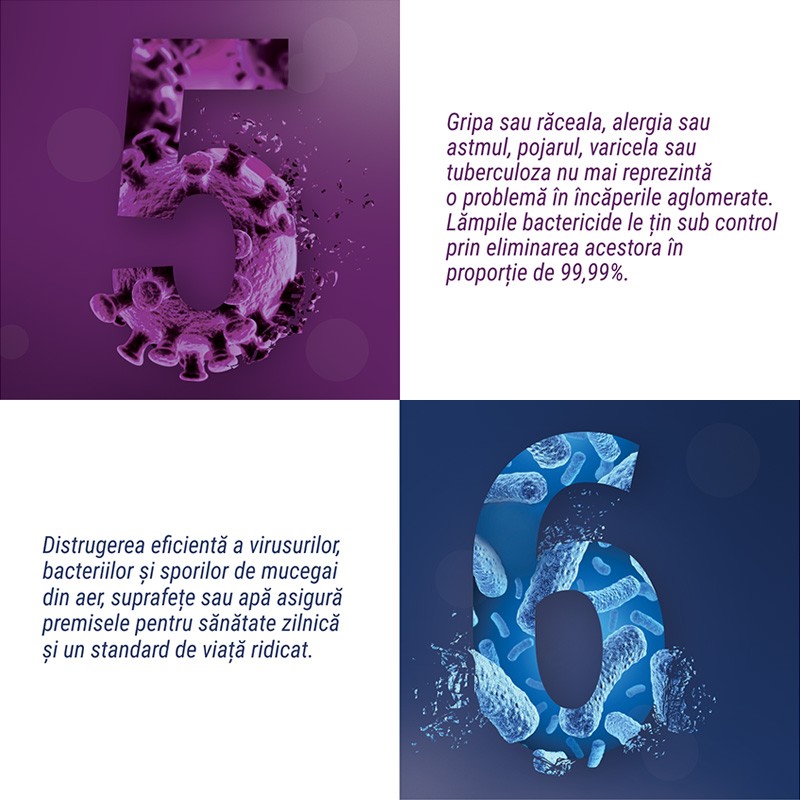 Lampa bactericida Biocomp distruge pana la 99.9% din microorganismele din mediu, cum sunt: bacteriile, virusurile, sporii de mucegai, drojdiile, algele, protozoarele si alte microorganisme.