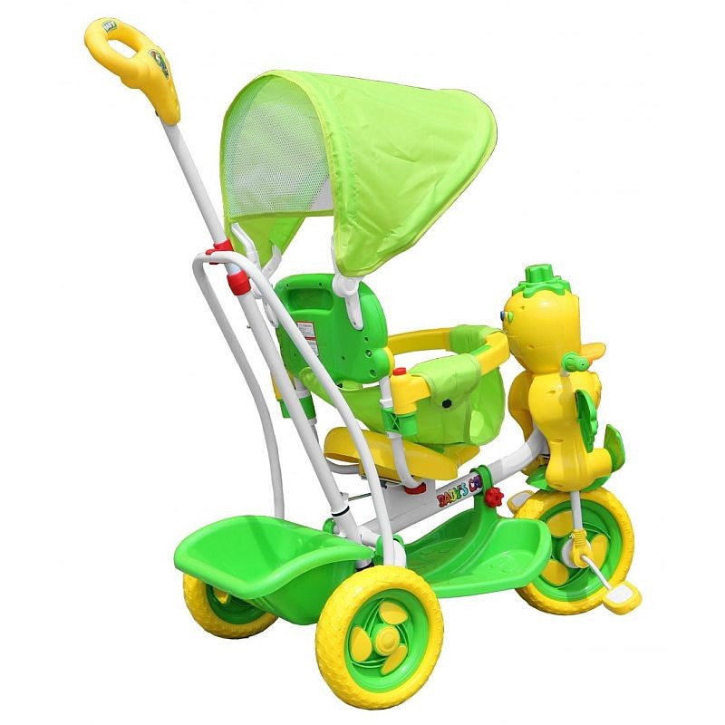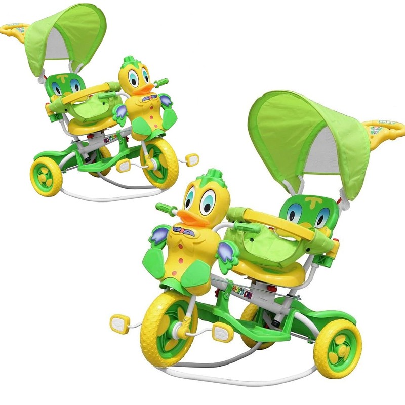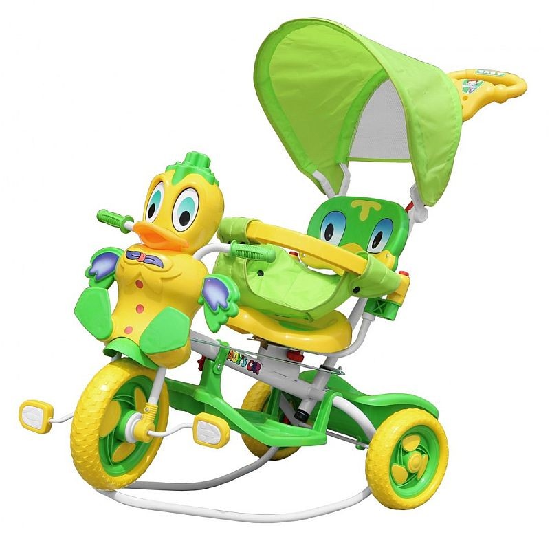 Tricicleta copii 2 in 1, functie balansoar, protectie soare, efecte sonore, Rata verde