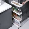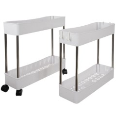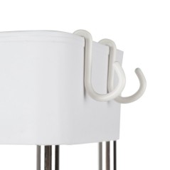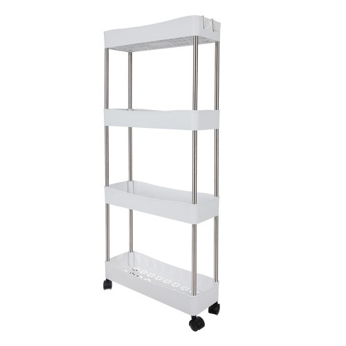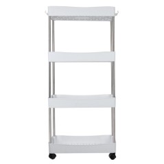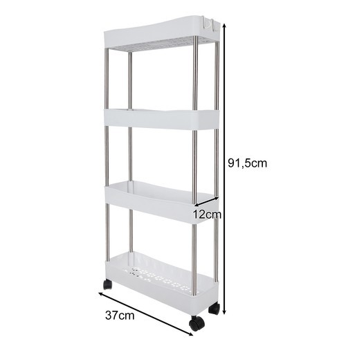 Echipata cu roti pivotante la 360 de grade, etajera poate fi mutata cu usurinta dintr-un loc in altul, fara efort. Mobilitatea o face potrivita pentru a fi utilizata chiar si in spatii temporare sau greu accesibile. In plus, cele patru carlige laterale sunt perfecte pentru agatarea prosoapelor, manusilor sau altor accesorii de mici dimensiuni. Poate avea pana la patru niveluri, permitandu-va sa stocati mai multe articole, dar poate fi pliata intr-o forma inferioara, mai compacta. Datorita designului modular, utilizatorul poate regla independent inaltimea raftului in functie de nevoile sale si de conditiile spatiale.