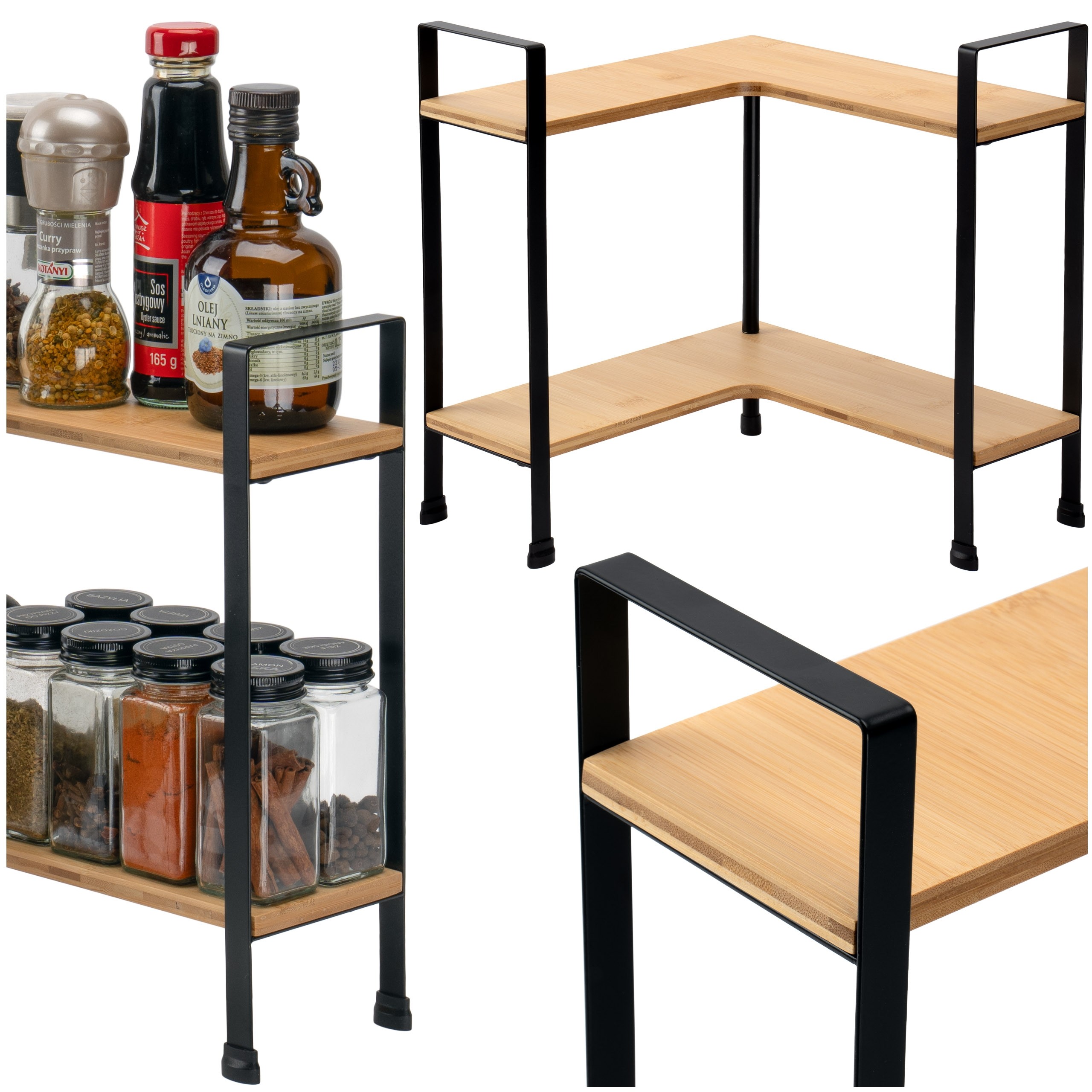 Raft depozitare condimente, amplasare pe colt, otel si bambus, 33,5x29,5x29,5 cm