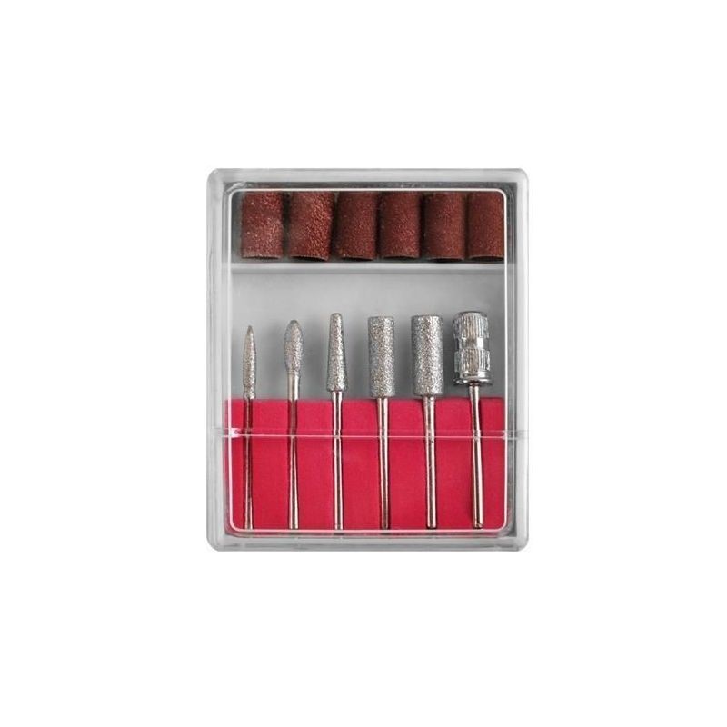 Acest set contine 6 capete diferite pentru slefuire, potrivite pentru freza electrica sau pila profesionala, fiind destinate mai multor actiuni precum: pilire, indepartarea ojei de pe unghii, polizare, lustruire, indepartarea cuticulelor.