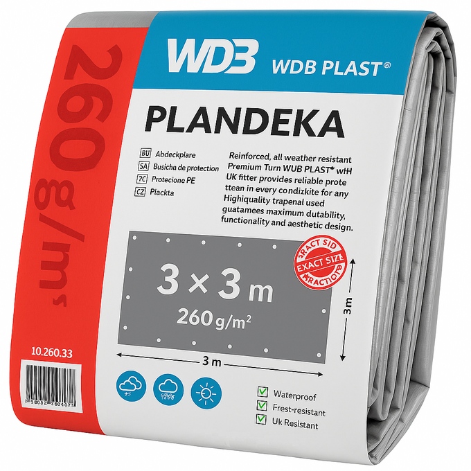 Prelata ranforsata 3 x 3 m, cu densitate de 260 g/mp, este o solutie durabila si eficienta pentru protejarea diferitelor bunuri impotriva ploii, prafului, vantului si altor factori de mediu. Fabricata din polietilena de inalta densitate, aceasta prelata ofera o rezistenta superioara la uzura si conditii meteorologice dificile, fiind potrivita pentru utilizari frecvente in gospodarie, gradina, agricultura sau pe santier.