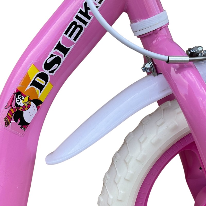 Acest model de bicicleta este special conceput pentru fetite, datorita culorilor placute in nuantele de alb si roz si a imprimeului cu floricele. Elementele colorate se regasesc atat pe cadru, cat si pe aparatoare si pe rotile ajutatoare. Aceasta este recomandata pentru copiii cu inaltimea cuprinsa intre 87-110 si si varsta intre 3 si 5 ani.