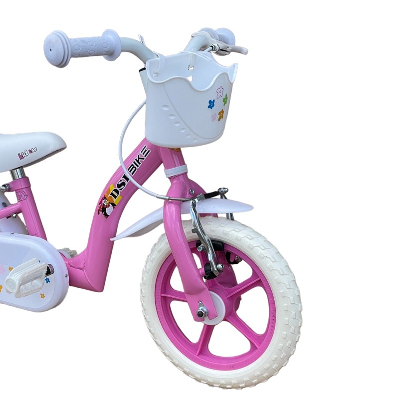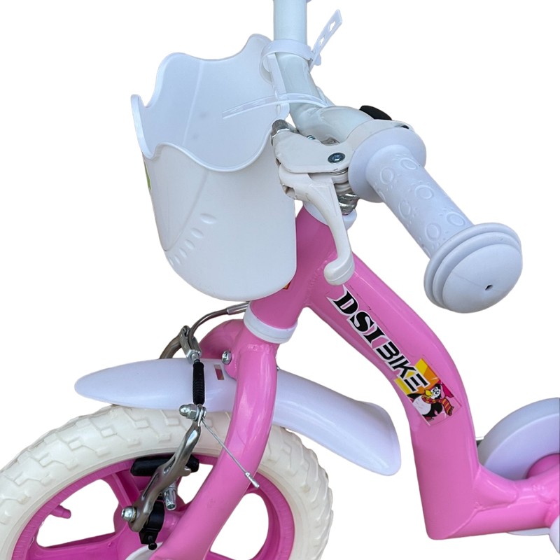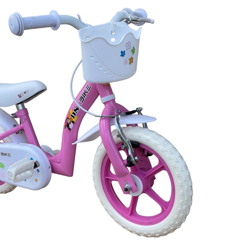 Bicicleta 12 inch, roti ajutatoare, cos cumparaturi, sistem franare V-brake, alb roz, RESIGILAT