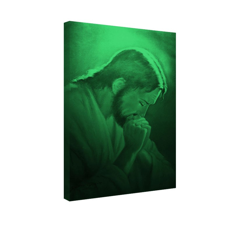Tabloul fosforescent Iisus rugandu-se este o imprimare de inalta rezolutie pe canvas profesional, avand proprietatea de a lumina in intuneric. In prezenta luminii naturale sau artificiale arata ca orice alt tablou obisnuit dar in intuneric imaginile imprimate devin vizibile dezvaluind imagini suprinzatoare. Cerneala folosita la imprimare este ecologica si nu contine plumb sau fosfor avand o mare putere de retinere-emitere de energie prin absorbtia luminii naturale sau artificiale.