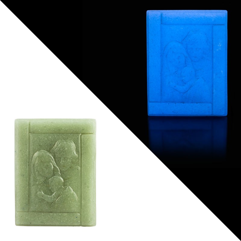 Mini tabloul fosforescent reda o imagine unica a iubirii dintre mama, tata si copil si este cadoul potrivit pentru cei pasionati de obiecte confectionate handmade. Tabloul este realizat din acril non-toxic, la lumina zilei este verde iar in intuneric lumineaza albastru.