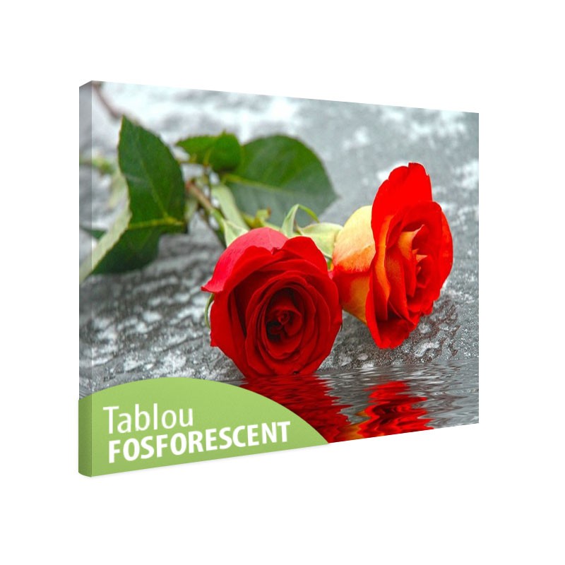 Tabloul fosforescent Trandafiri pe apa este o imprimare de inalta rezolutie pe canvas profesional, avand proprietatea de a lumina in intuneric. In prezenta luminii naturale sau artificiale arata ca orice alt tablou obisnuit dar in intuneric imaginile imprimate devin vizibile dezvaluind imagini suprinzatoare. Cerneala folosita la imprimare este ecologica si nu contine plumb sau fosfor avand o mare putere de retinere-emitere de energie prin absorbtia luminii naturale sau artificiale.