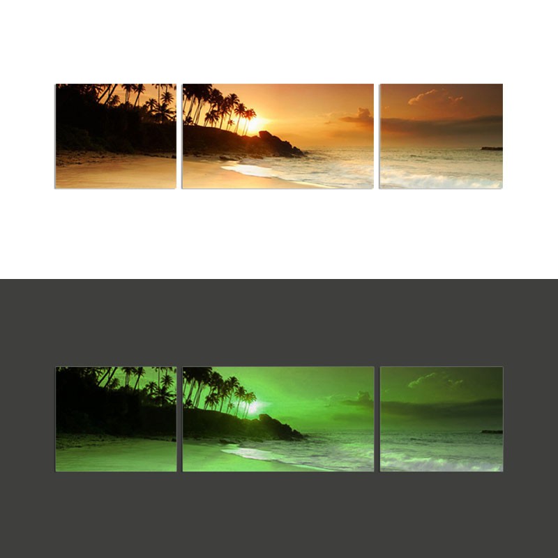 Tabloul fosforescent Tropical Sunset este alcatuit din trei piese care impreuna redau o imagine tropicala superba a apusului de soare. Tabloul este o imprimare de rezolutie inalta pe canvas cu proprietatea de a lumina in intuneric.