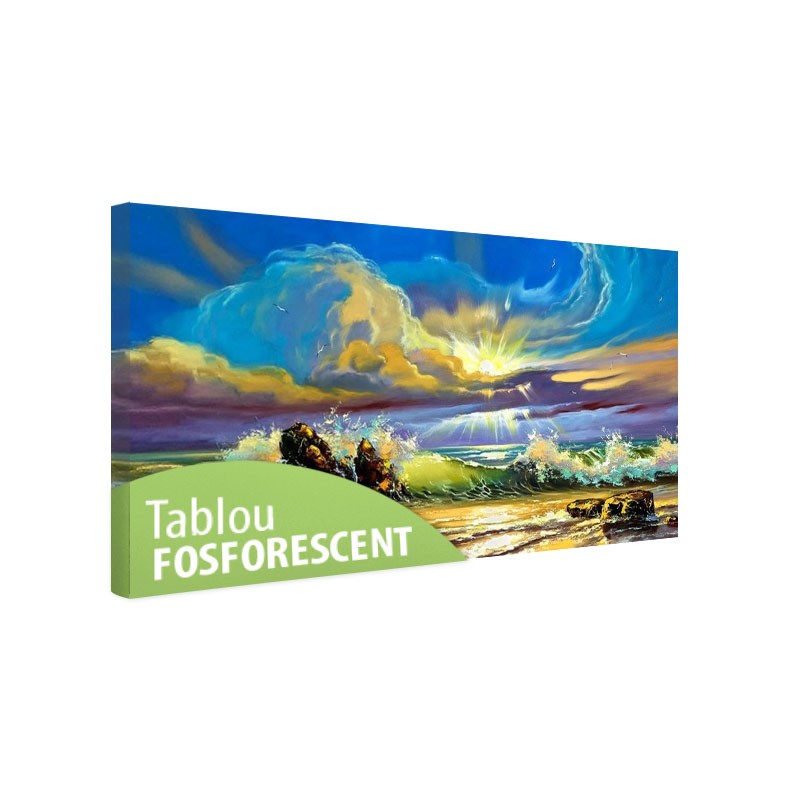 Tabloul fosforescent Apus de soare pe malul marii este o imprimare de inalta rezolutie pe canvas profesional, avand proprietatea de a lumina in intuneric. In prezenta luminii naturale sau artificiale arata ca orice alt tablou obisnuit dar in intuneric imaginile imprimate devin vizibile dezvaluind imagini suprinzatoare. Cerneala folosita la imprimare este ecologica si nu contine plumb sau fosfor avand o mare putere de retinere-emitere de energie prin absorbtia luminii naturale sau artificiale.